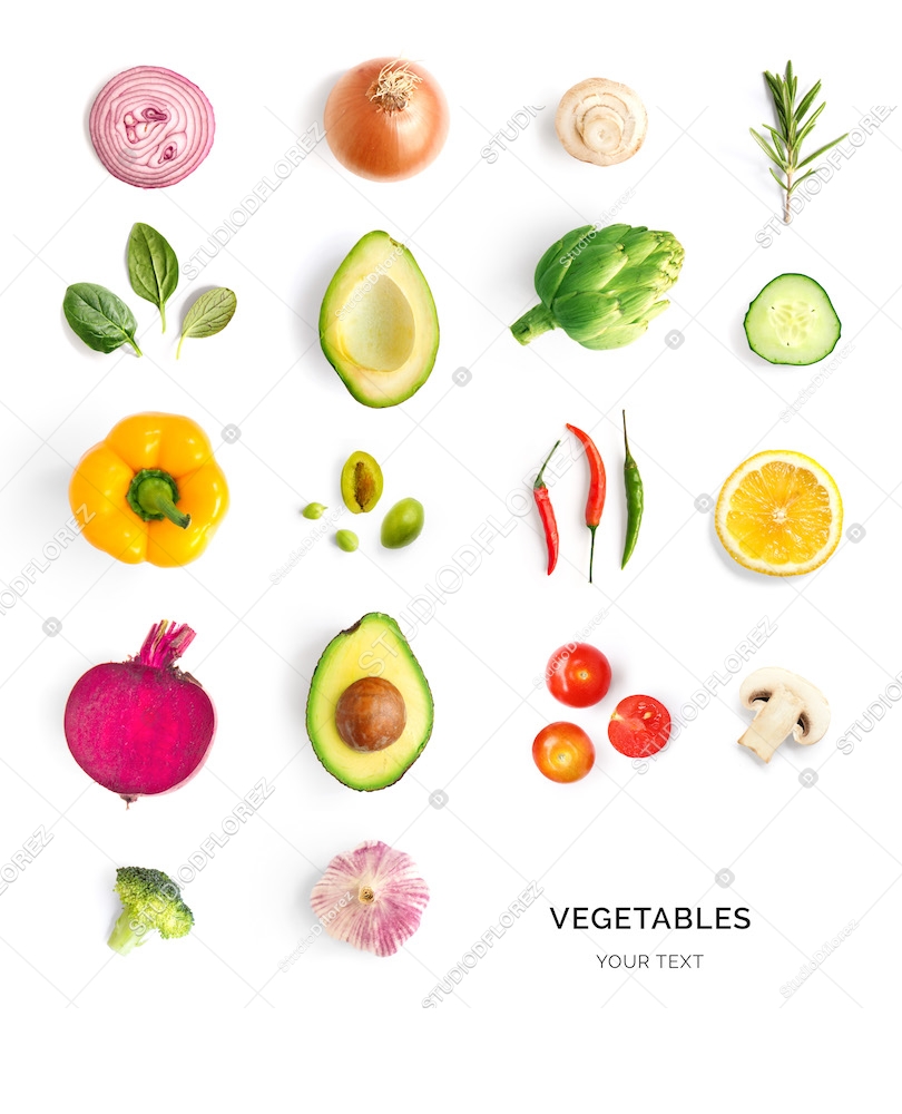 Creative layout made of avocado, tomato, onion, beetroot, pepper, artichoke, broccoli and cucumber on the white background.. Flat lay. Food concept.