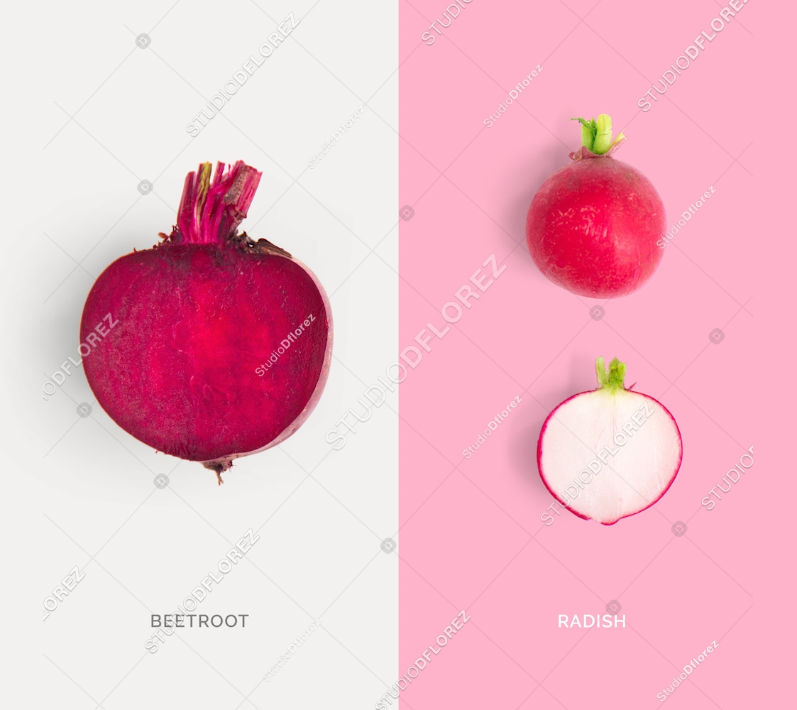 Creative layout made of beetroot and radish. Flat lay. Food concept.