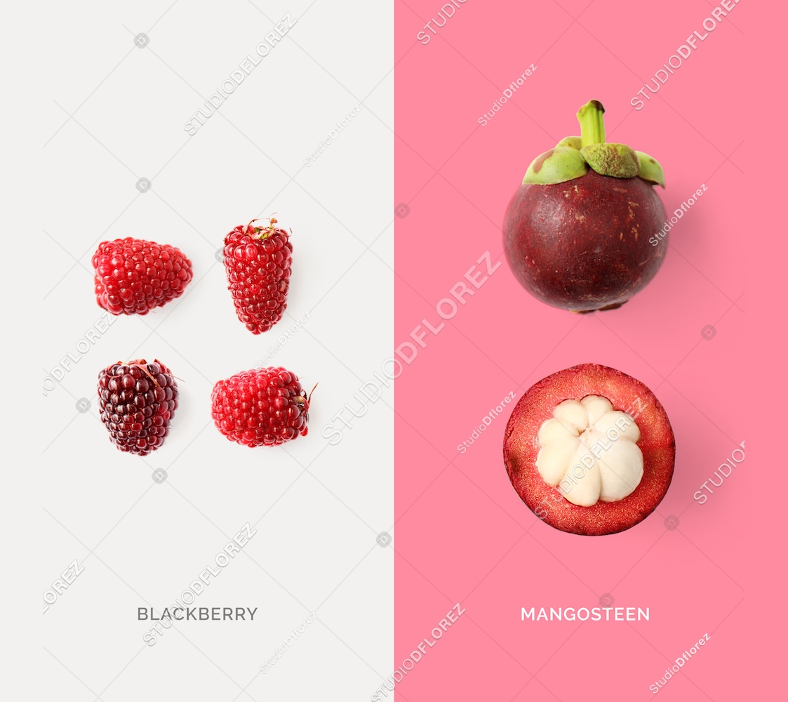 Creative layout made of mangosteen and blackberry. Flat lay. Food concept. Macro concept.
