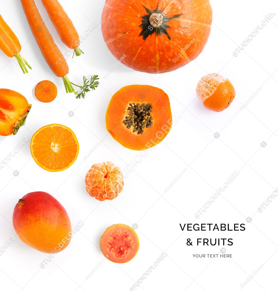 Creative layout made of orange vegetables and fruits. Flat lay. Food concept. Pumpkin, papaya, orange, carrot, mango, guava, tangerine on the white background.