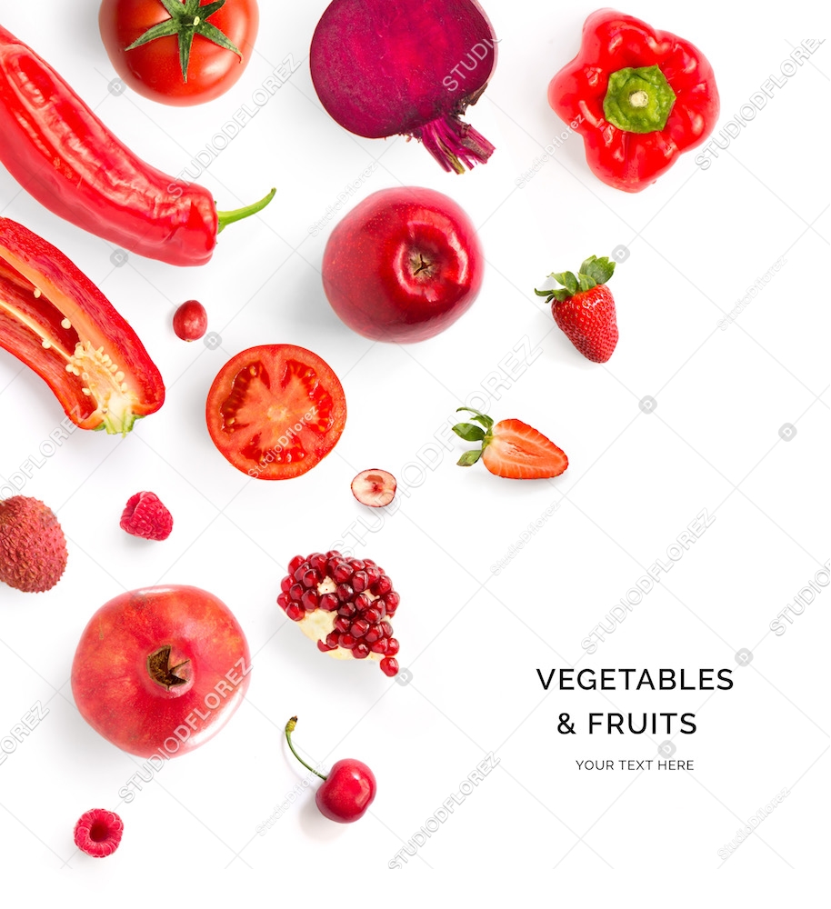 Creative layout made of red vegetables and fruits. Flat lay. Food concept. Tomato, red apple, pomegranate, red pepper, raspberry, strawberry, cherry, beetroot and lychee on the white background.
