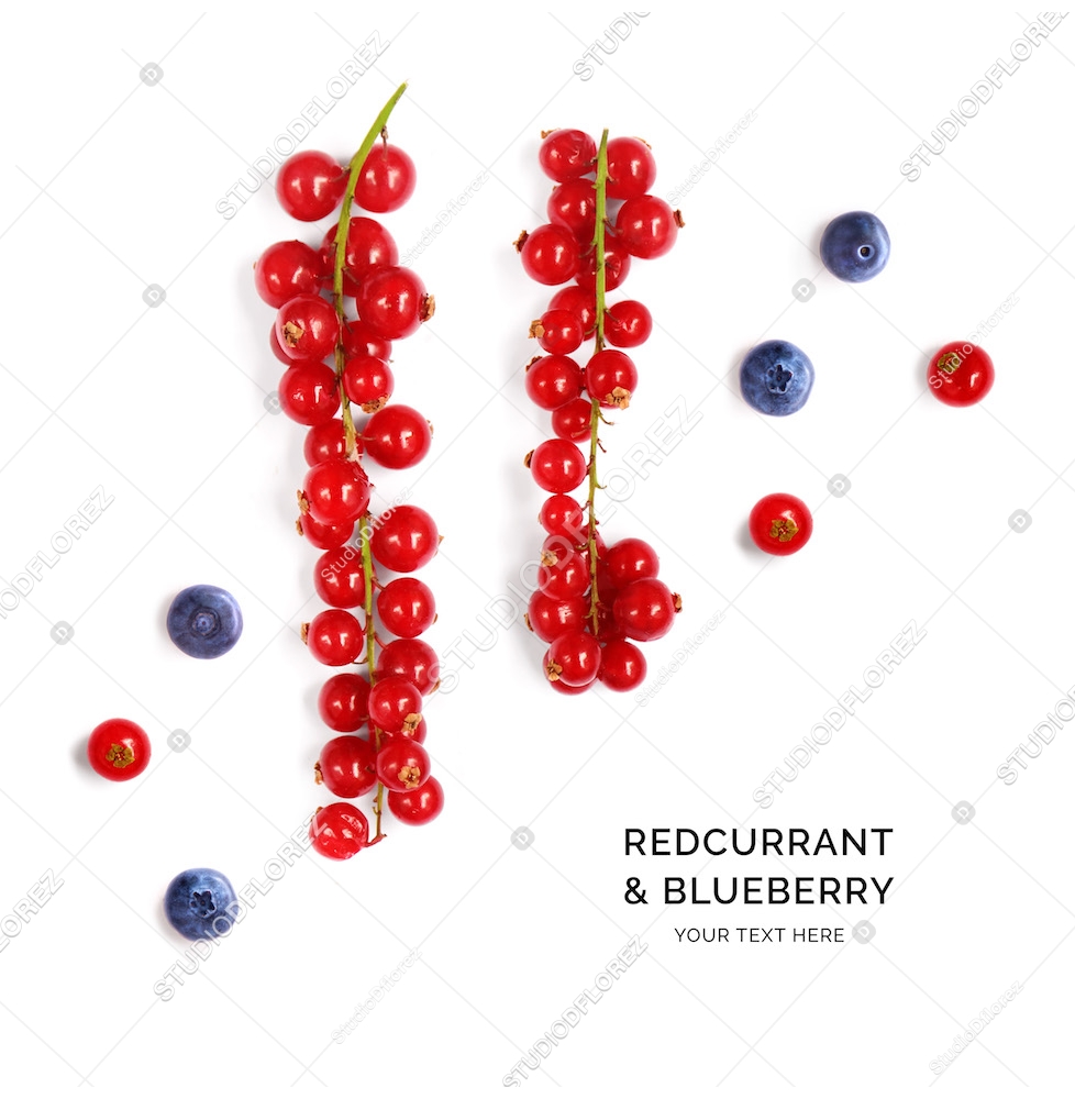 Creative layout made of redcurrant and blueberry on the white background. Flat lay. Food concept.
