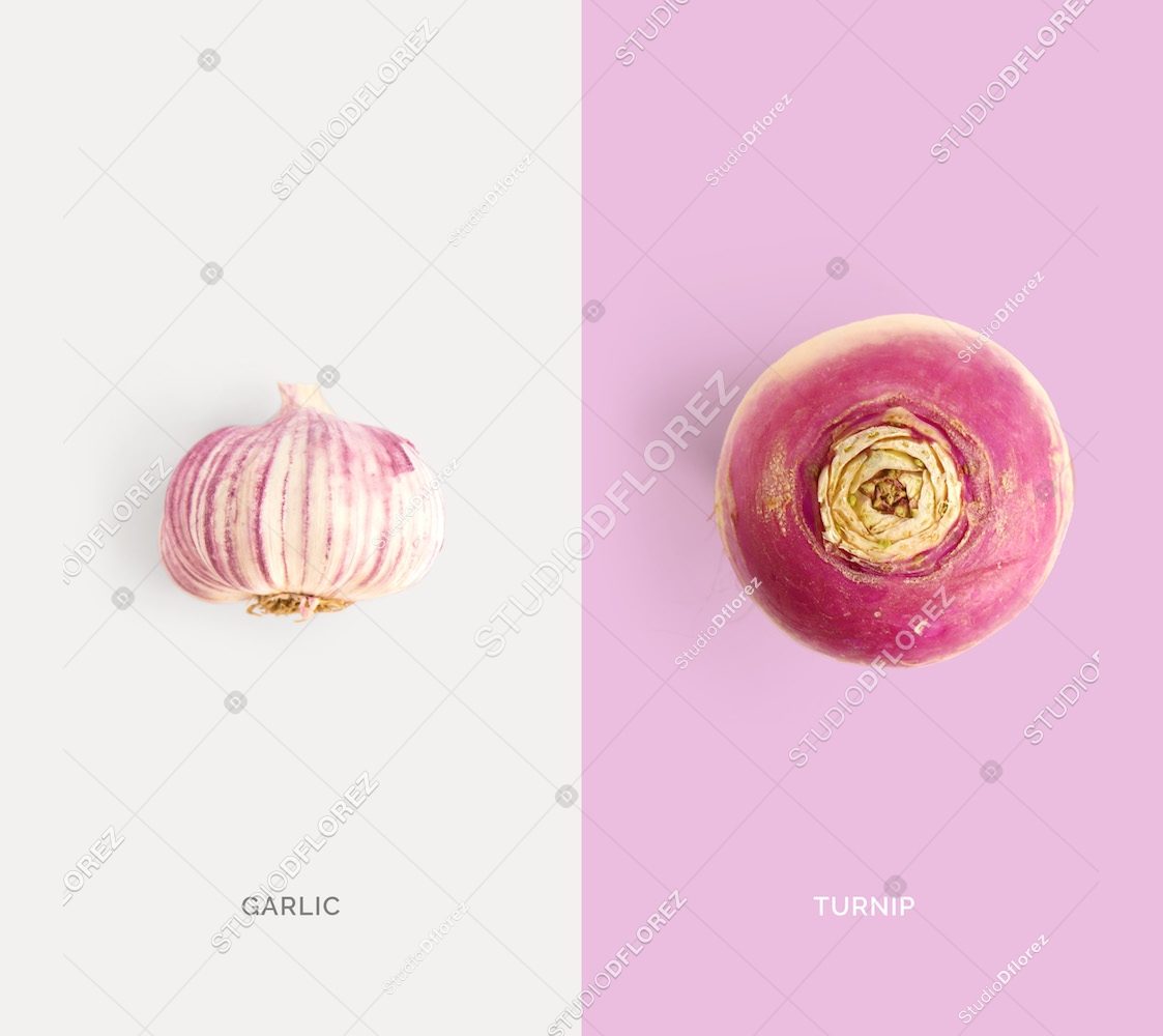 Creative layout made of turnip and garlic. Flat lay. Food concept. Macro concept.